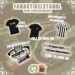 Ab dem morgigen Heimspiel gibt’s beim G2A Stand’l Fanartikel zum 120. Vereinsjubiläum der Admira.Sowohl vom Trikot, dem T-Shirt als auch dem Seidenschal gibt es exakt
